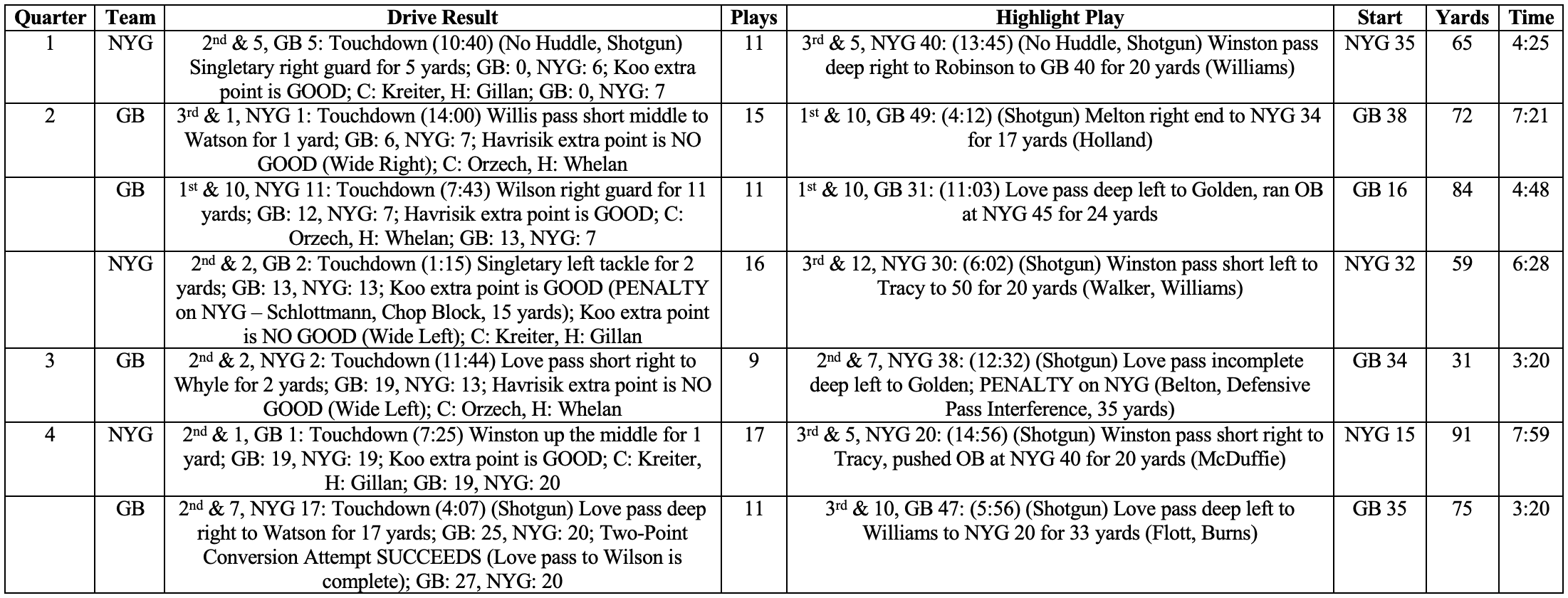 Green Bay was trailing by one point as they began their eventual game-winning drive at their own 35-yard line. Four plays later, they were faced with third-and-10, which was where the Giants blew the game.